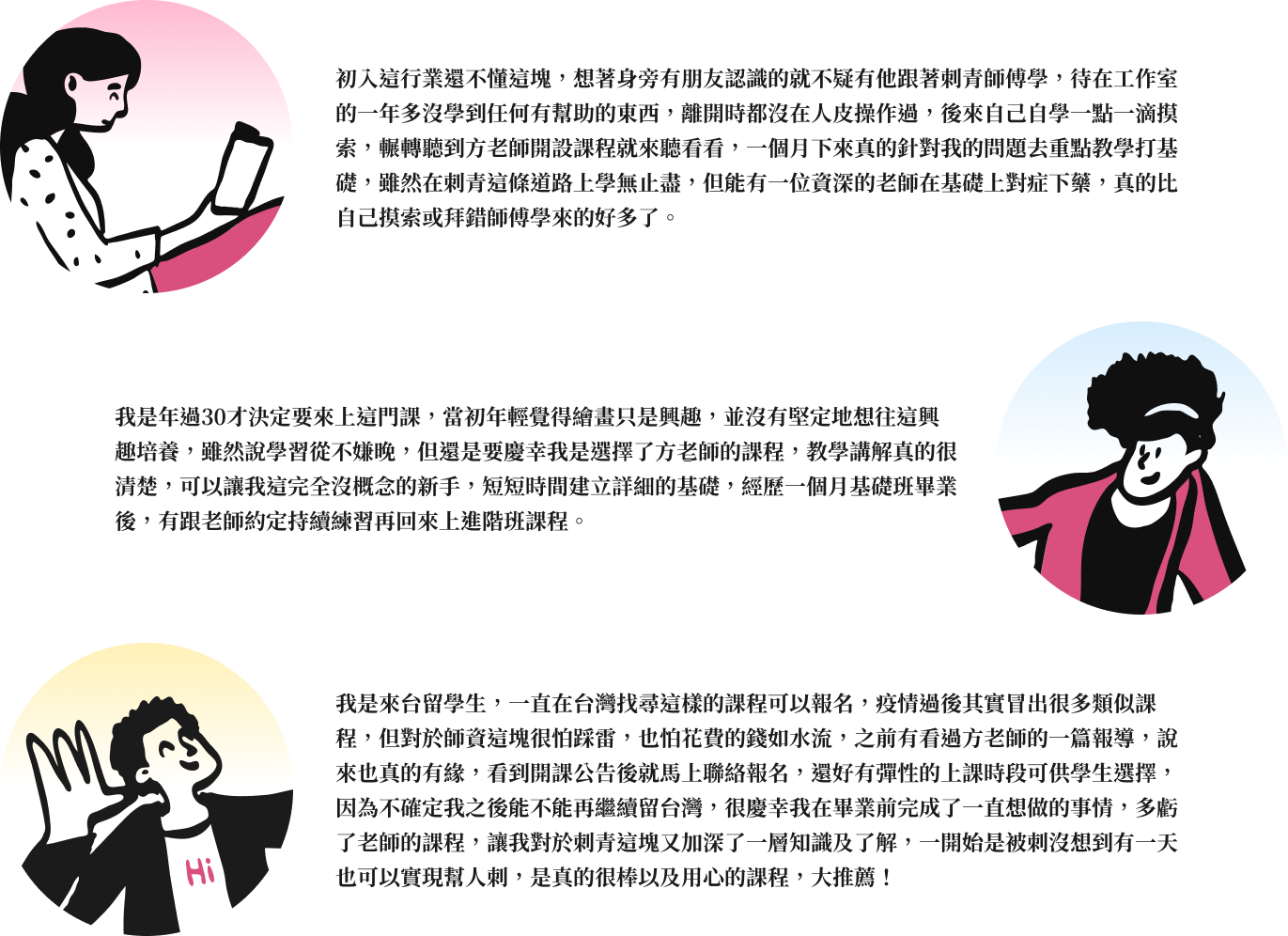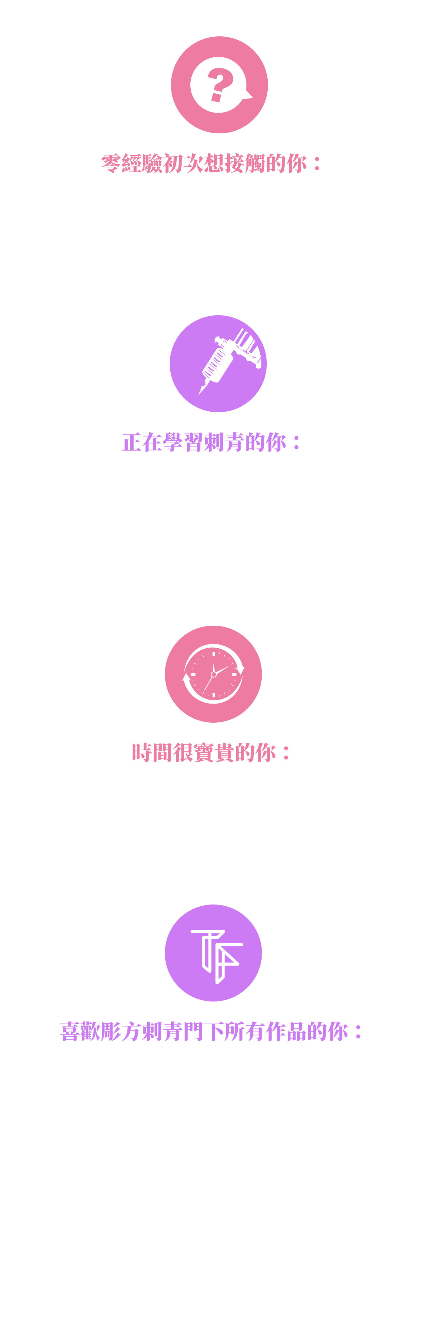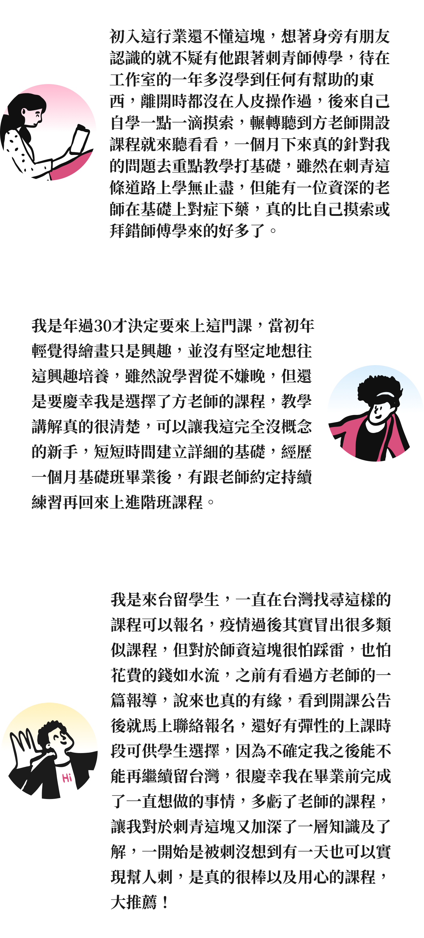 - 零繪畫基礎或有深厚繪畫能力的你,一直對這門技術有興趣,但市面上各類刺青教學、廣告繁多無從下手,不知如何詢問了解。