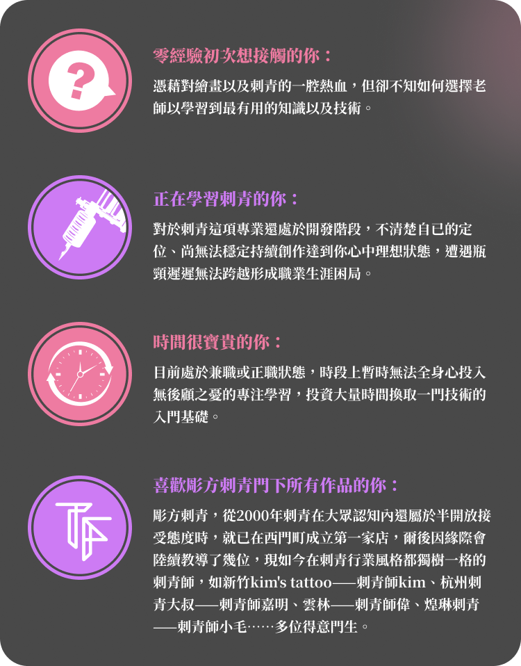- 零繪畫基礎或有深厚繪畫能力的你,一直對這門技術有興趣,但市面上各類刺青教學、廣告繁多無從下手,不知如何詢問了解。